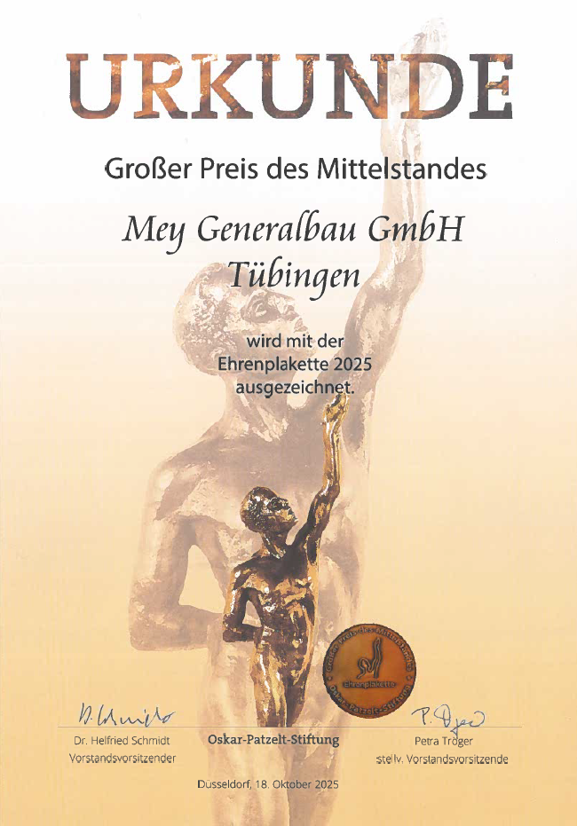Tübingen, den 21.10.2025: Mey Generalbau wurde als Preisträger des „Großen Preis des Mittelstandes“ 2025 ausgezeichnet und zählt somit zu den besten vier von 914 nominierten Unternehmen in Baden-Württemberg. Ein herausragender Erfolg für das mittelständische Unternehmen mit Sitz in Tübingen, Stuttgart, Balingen, Villingen-Schwenningen und Göppingen. Eine Ehrenplakette auf Bundesebene krönt den Erfolg. Von 25 Preisträgern aus 12 Wettbewerbsregionen haben nur drei Unternehmen diese besondere Auszeichnung erhalten.